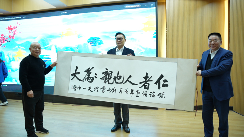 校園參訪中,孔垂長一行實(shí)地考察了教學(xué)設(shè)施與校園環(huán)境,隨后出席在學(xué)校多功能報(bào)告廳舉辦的傳統(tǒng)文化歡迎活動(dòng)。該校師生以拜師禮、古琴演奏、太極展演及《弟子規(guī)》吟誦等節(jié)目,展現(xiàn)對中華文化的傳承。孔垂長以“學(xué)以成人”為主題發(fā)表致辭,強(qiáng)調(diào)在人工智能時(shí)代,教育更應(yīng)回歸“成人之道”:“教育需培養(yǎng)有道德判斷力的心靈與理解人性溫度的靈魂。孔子所言‘志于道,據(jù)于德,依于仁,游于藝’啟示我們,在科技洪流中需守護(hù)對美的感知力,保持思辨銳度。”他勉勵(lì)學(xué)子成為“科技方舟的駕馭者”與“文化精神的擺渡人”,并向天一中學(xué)贈(zèng)送親筆題字的晶瓷孔子像,校方則以書法作品回贈(zèng)。