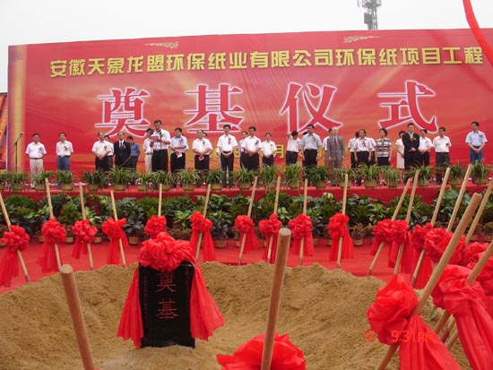 市委書記、市人大常委會主任畢美家代表市委、市政府對項目奠基表示熱烈祝賀。他說,天象龍盟環保紙項目的實施,對于我市大力推進工業強市戰略,優化產業結構,發展循環經濟,建設資源節約型、環境友好型社會,加快城市轉型步伐具有重要的引領作用,對于淮北調結構、保增長、促就業具有重要的現實意義。