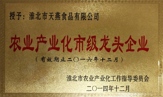 熱烈祝賀淮北市天燕食品有限公司被淮北市農(nóng)業(yè)產(chǎn)業(yè)化工作委員會(huì)評(píng)為“農(nóng)業(yè)產(chǎn)業(yè)化市級(jí)龍頭企業(yè)”。