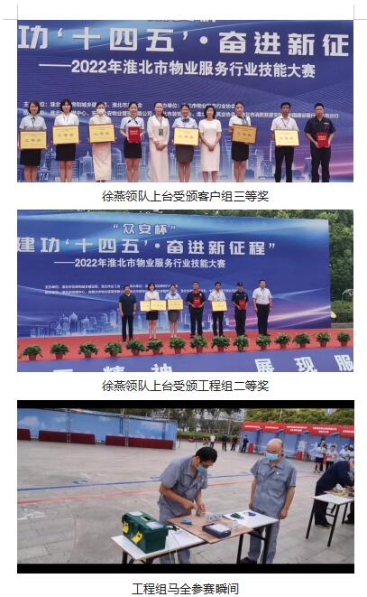 2022年8月26日上午,淮北市首屆物業服務行業技能比賽在市體育場隆重舉行,天象物業代表隊一行14人參加了活動賽事。經過十余天的緊張備戰,天象物業公司在參加的三個比賽項目中,兩項獲獎。工程組榮獲二等獎、客戶組榮獲三等獎的殊榮,其中工程組參賽選手馬全在工程理論知識競賽中排名第一。